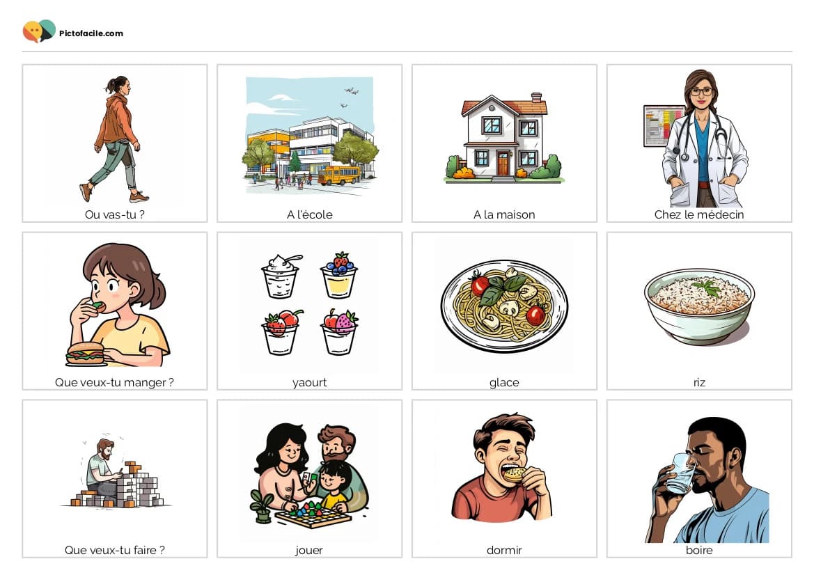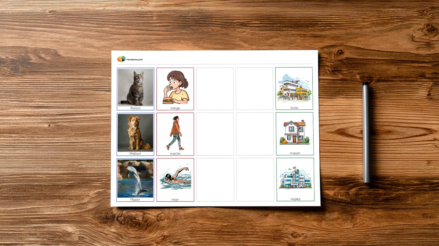 Concevez des grilles de communication en ligne sans avoir à découper, imprimer ou coller. Insérez vos mots et images dans une structure propre, lisible et entièrement adaptable à vos besoins, en 3 clics.