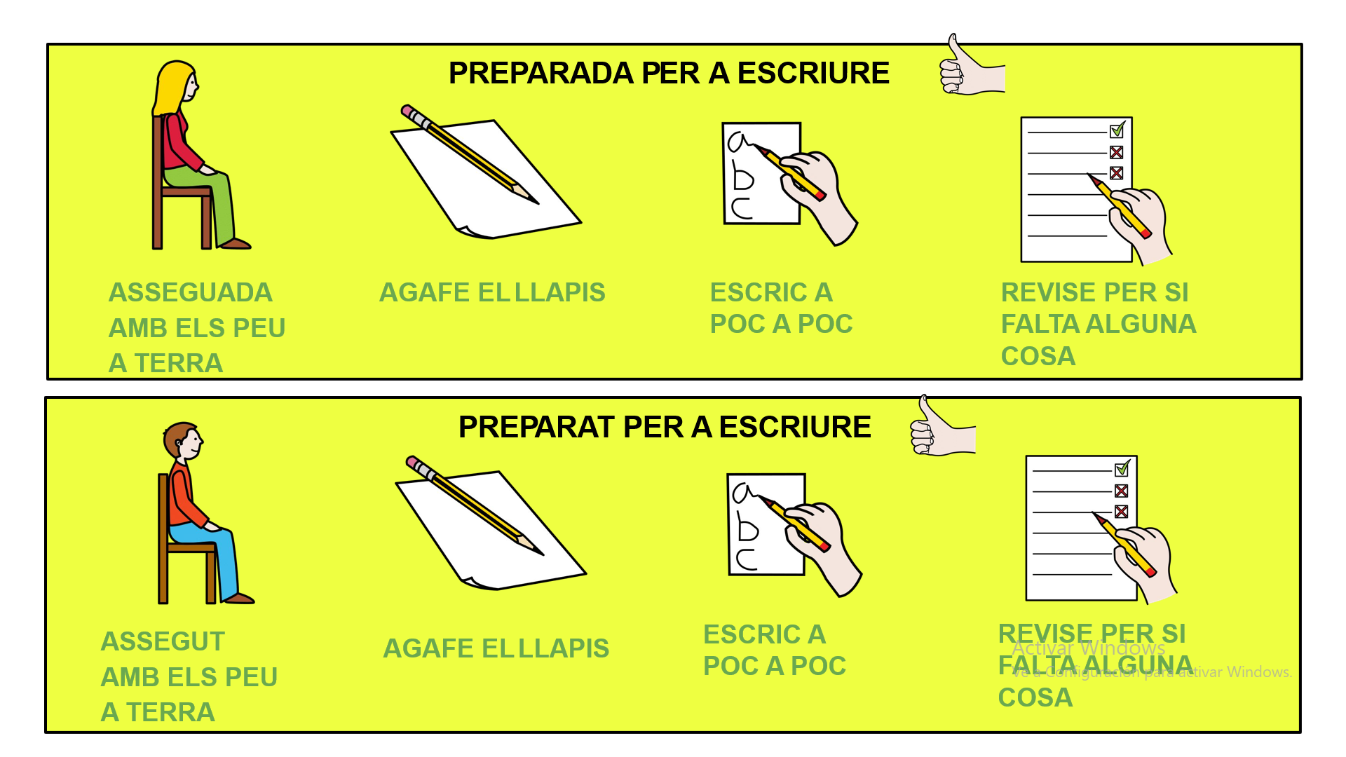 Seqüències per a indicar a l'alumne/a com ha de fer una tasca (escoltar, llegir, escriure, ...) a l'aula. Aquest tipus de suports visuals ajuden a autoregular la seua conducta, anticipant la tasca i e